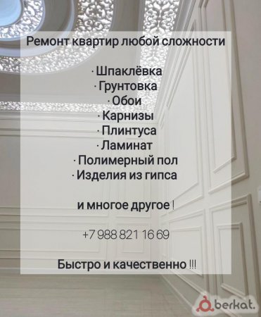 Ремонт квартир любой сложности • Шпаклёвка • Грунтовка • Обои • Карнизы • Плинтуса и многое другое ! Писать на WA +79888211669 Быстро и качественно !