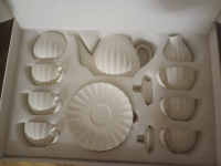 Сервиз расчитан на 6 персон,отделка из красного бархата. Состояние отличное. Не тяжелая посуда. Кувшин и чайник с крышечками, молочник, 6 чайных чашек, 6 кофейных чашек и сахарница. Могу отправить через СДЭК, почту России.