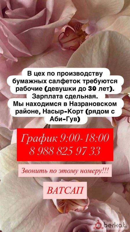 В цех по производству бумажных салфеток требуются рабочие (девушки до 30 лет). Звонить по этому номеру 8 988 825 97 33 ватсапп Зарплата сдельная. Мы находимся в Назрановском районе, Насыр-Корт (рядом с Аби-Гув) График 9:00-18:00 8 988 825 97 33 Звонить по этому номеру!!! ВАТСАП