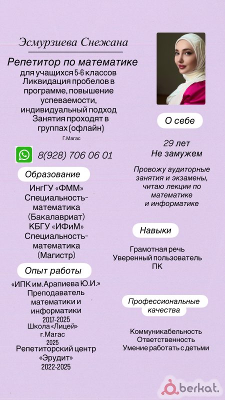 Репетитор для 1-8 классов, индивидуальные занятия Математика без слез Обо мне: Закончила школу на медаль Учусь в физмате Опыт работы репетитором имеется